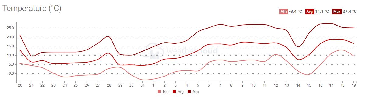 Wir hatten bei uns die letzten 30 Tage praktisch nur Sonne (253 Stunden). Auch die Temperatur war im Durchschnitt 11°C.